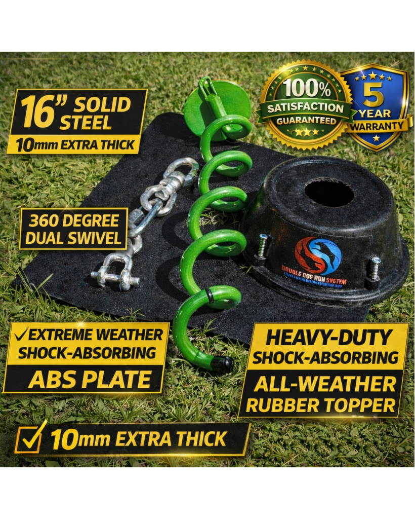 Double Dog Run manufactures the strongest heavy-duty dog tie out on the market. Made of the highest quality materials, Double Dog Run is the only tangle-free two dog tie out stake systems on the market! These shock absorbing and tangle-free two dog tie out stake systems can be easily installed into the ground holding up to 1200 pounds of pull force with our smallest system holding 425lbs of force! These safe and secure heavy duty dog tie out stake systems will keep your pets safe, secure and tangled-free!